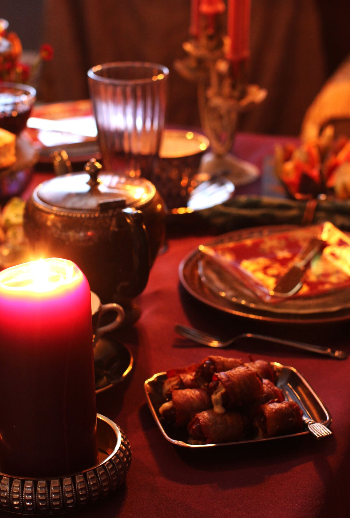 It's dark, it's cozy, it's moody in the most comforting way. This magical afternoon tea party is a celebration of the slide into those sultry months of winter. Decorate a warm and welcoming corner of your home for an intimate gathering. Serve a variety of dark and delicious autumnal treats, both savoury and sweet. Make these simple bacon wrapped dates for a warm appetizer, and follow that with tea sandwiches, scones, and selection of seductive treats. Wave your magic wand and voilà . . .