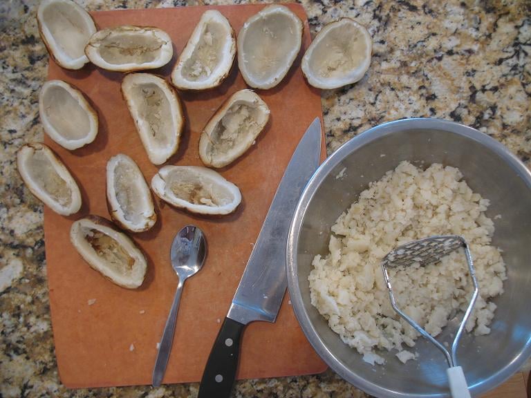 Cut the baked potatoes in half lengthwise and scoop out the insides with a spoon, careful to leave a ¼" (½cm) shell of potato flesh around the outside. Pile the scooped-out insides into a bowl and mash them with a potato masher or fork.