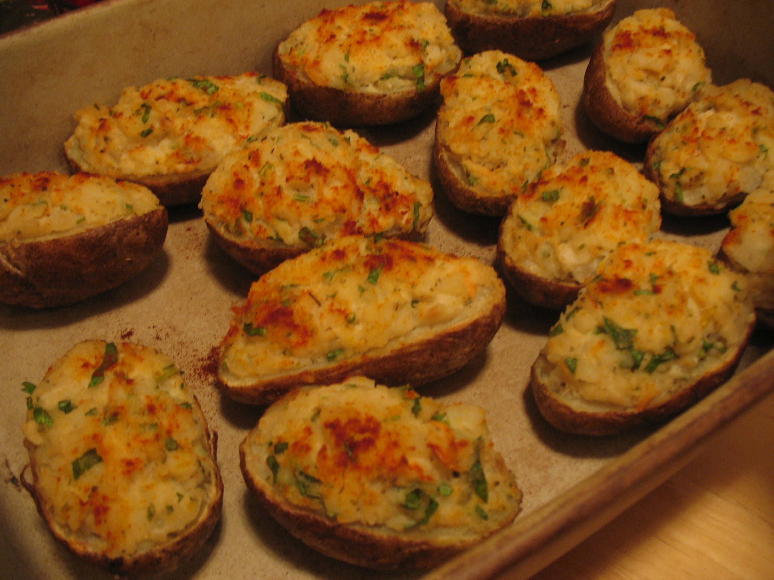 Mix it all lightly together, then mound the filling into the scooped-out potato halves, shaping the tops smooth with a teaspoon. Set the filled halves into a 9x13"pan. Sprinkle with the smoked paprika and bake at 350ºF for 45 minutes.