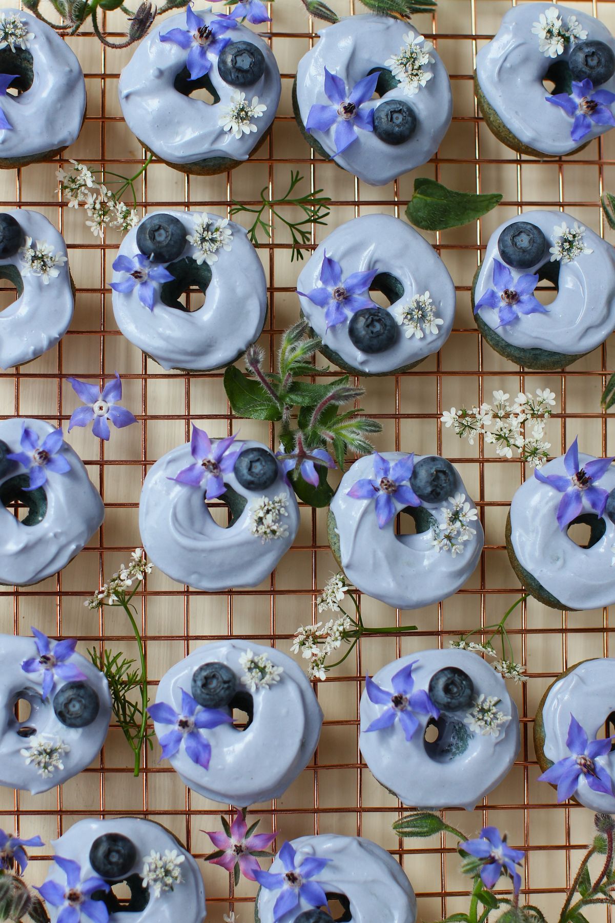 - Tip the pan over onto a cooling rack to let the donuts fall out of the pan. Leave to cool completely, then frost with the Cream Cheese Honey Glaze and decorate with a blueberry and small edible flowers on each one.