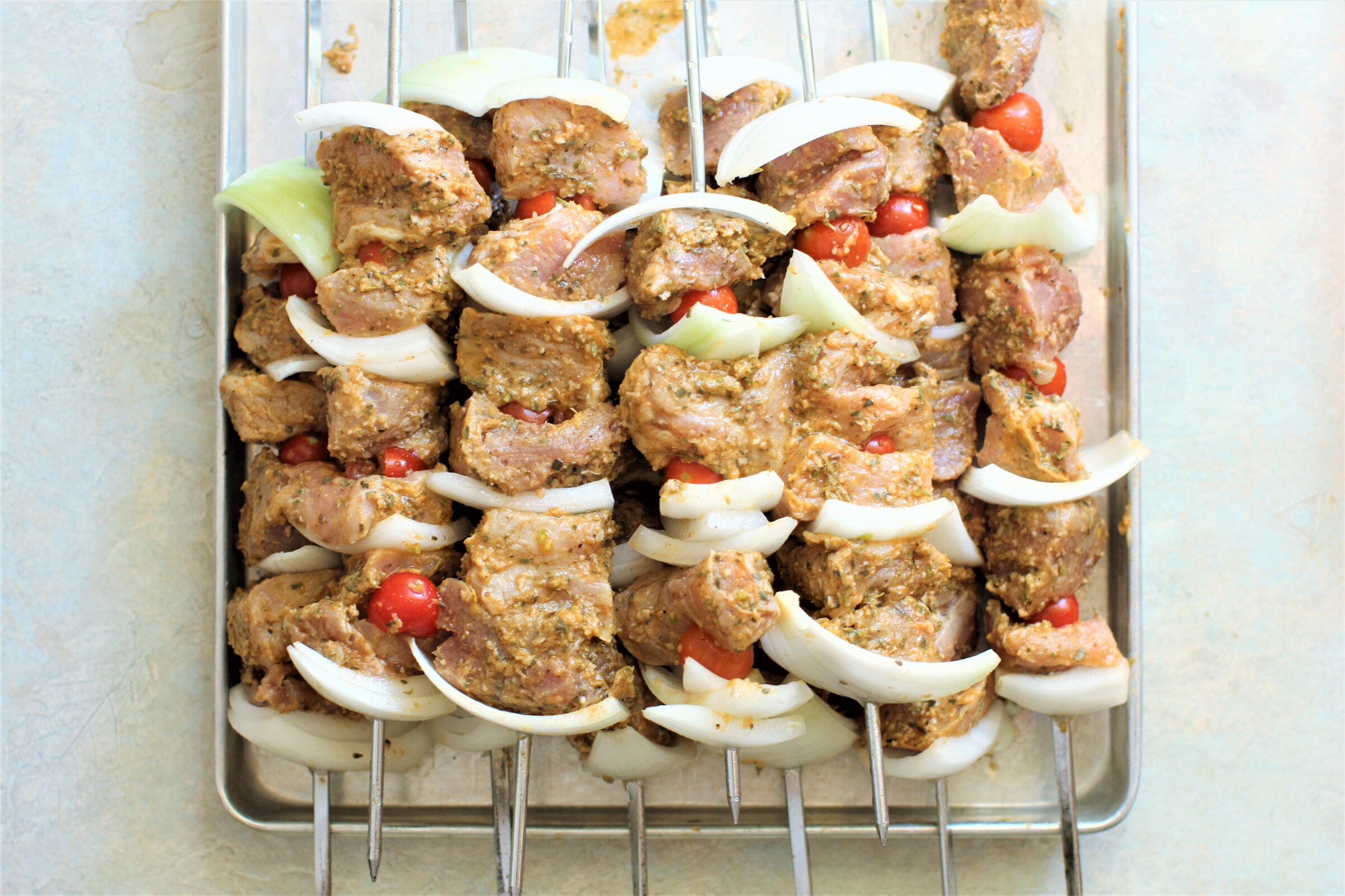 - To Make Kebabs: Marinate cubes of meat (pork or chicken work well) in the souvlaki marinade. Thread the meat pieces onto skewers (can alternate with chunks of onions, peppers, cherry tomatoes, or zucchini), and grill until nicely browned and cooked through.