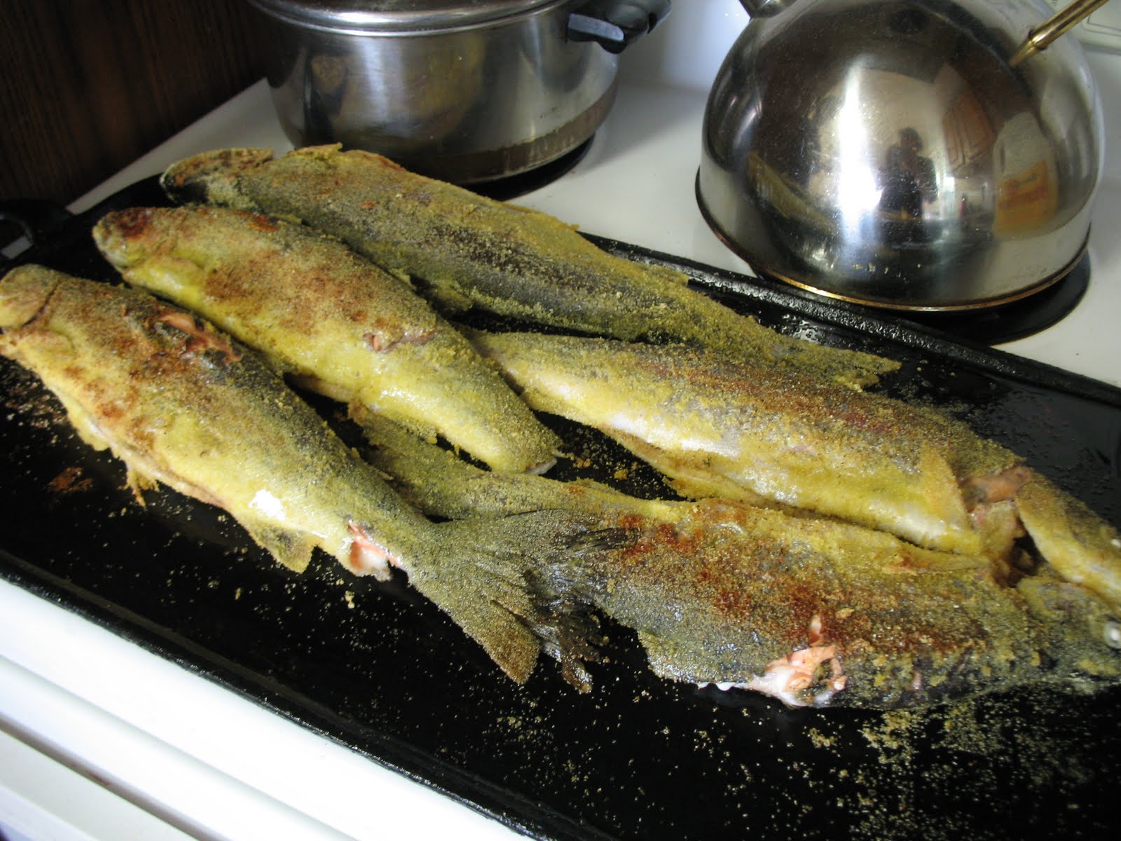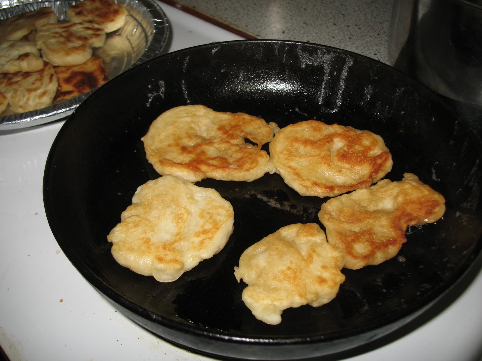 It is now ready to roast over the fire, or roll it into egg-sized balls, pull them flat to make little pancakes and fry them in a mixture of butter and oil in a preheated heavy pan. When they are golden brown on each side, they are ready to serve topped with the morel mushroom sauce. Or you can just sprinkle them with sugar and eat them standing at the stove. Or do both.